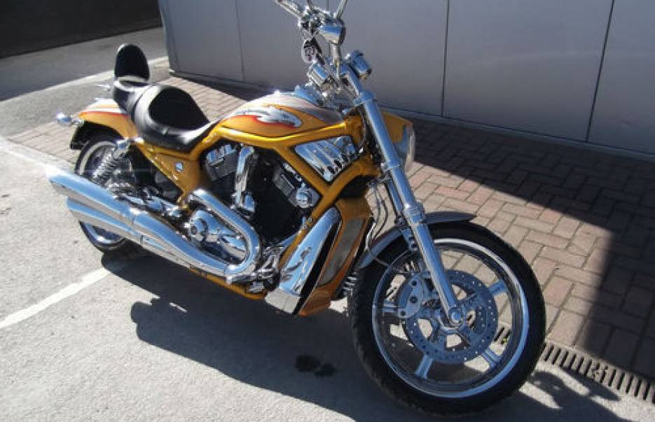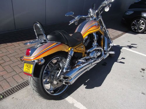 Metallic Yellow. 12 months MOT. Last serviced at 7. 84 miles. Excellent bodywork. Tyre condition Good. This very rare Screaming Eagle CVO V rod is the most desirable version with the 1250cc Porsche developed liquid cooled engine and 240 section rear tyre. Not to mention all the chrome it comes with as standard and the astounding paintwork. This particular bike has also had some extras fitted including modified pipes. touring rider and pillion seat. sissy bar. rack. LED rear light. Chrome brake accents. Slotted chrome shifter arm. and a chrome licence plate frame.
