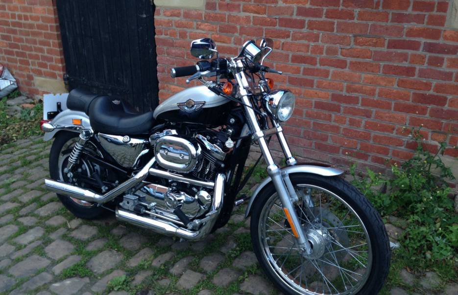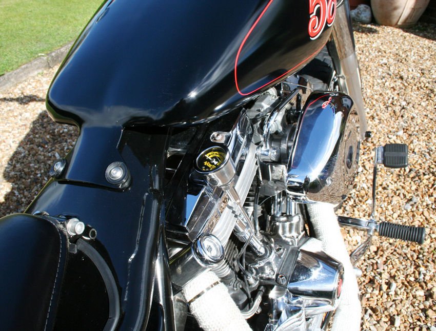 The exhaust seems standard with white bandage wrap for that Hotrod look. it's loud but passes MOT fine. I've also replaced the silencer wadding. It has a Badlands module which provides self cancelling indicators. Harley clock on the handle bars. Custom oil tank with side filler including temperature gauge. Accel Oil Pressure Gauge (see pics). Every nut and bolt I've undone has been replaced with stainless steal. inc. washers. (where possible). The only difference from the photos is the new (red) Taylor spark plug leads.