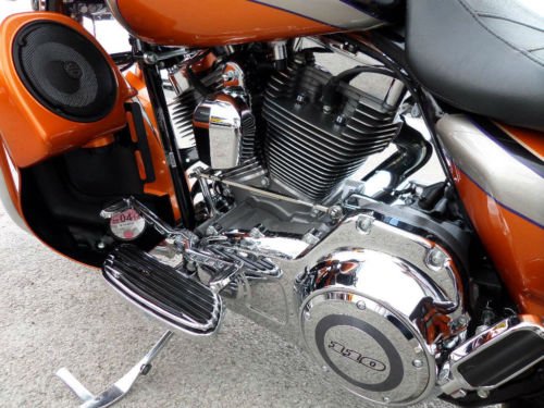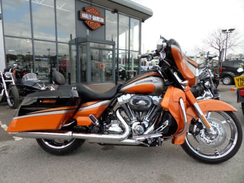 This MINT and Beautiful CVO Street Glide in HD Orange paint with Pale silver Graphics Looks Absolutely MINT and will Make Everyone jealous of your new CVO Street Glide! The Screamin' Eagle Twin Cam 110 Motor has all the Power and Torque that you will need and matched to the 6 speed transmission this Machine will Never let you down. The Street Glides have a low seat height which makes for easy handling and riding. and with an advertised " 47 MPG hi-way " & 6 U. S. gallon fuel tank you can ride endlessly! The CVO Harleys come Standard with Electronic cruise control. the ABS Braking system and Factory Security for added peace of mind if left out of sight. This Screamin` Eagle Street Glide Features New One-piece injection-molded extended saddlebags offer increased capacity. New Black 18-inch. seven-spoke. front and rear Agitator wheels feature contrast-chrome highlights that look Sweet. New Seven-spoke floating front brake rotors match the Agitator wheel. New Hydraulic rear shocks with hand-adjustable preload and optimized rebound and damping deliver outstanding response on a range of road surfaces. New Engine turned insert/emblem collection includes air cleaner. console insert with CVO™ logo. derby cover and timer cover. Many More Features! to many to list. This Street Glide Includes passenger backrest. It has just been serviced by ourselves and comes with 12 months Harley-Davidson Warranty. Delivery is available in the UK. this bike has to be seen as its like new.