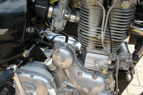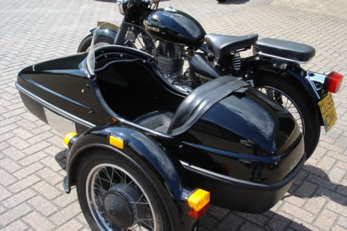 This motorcycle combo is in matching black with many upgrades i. e. Amal carb for ease of starting. endurance rear suspension. single and pillion seat and Velorex sports sidecar.