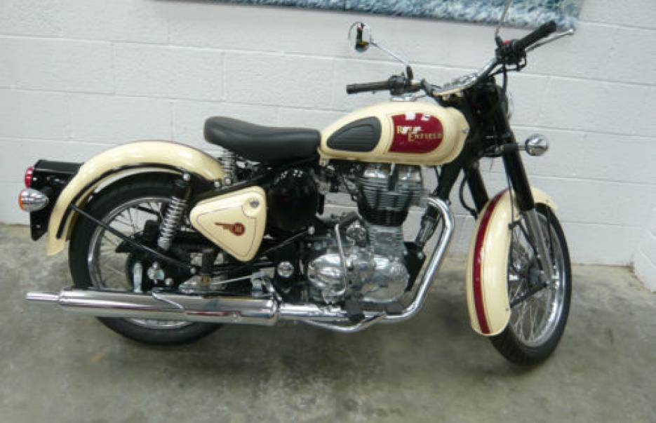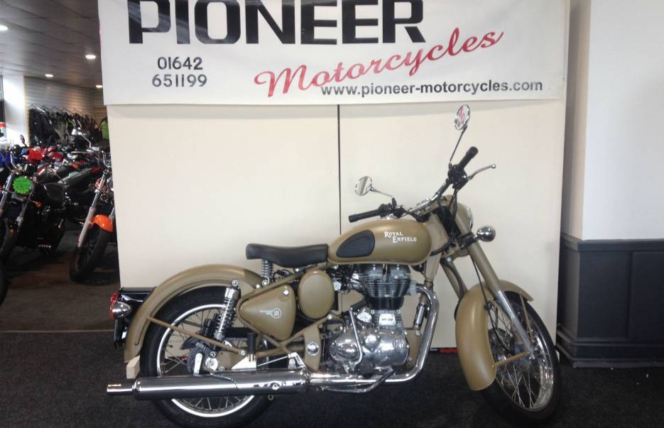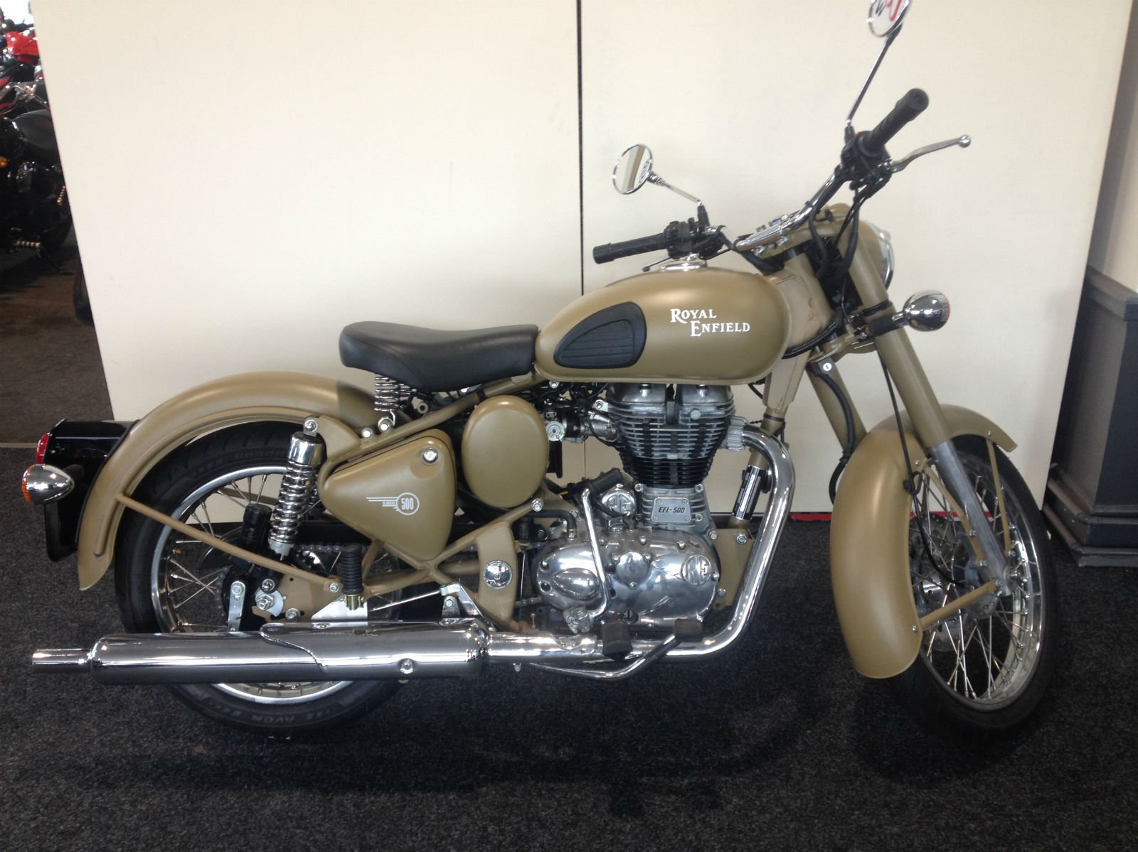 The Classic desert storm comes to you with a paint scheme reminiscent of the war era. a time when Royal Enfield motorcycles proved their capabilities and battle worthiness by impeccable service to soldiers in harsh conditions of the desert. Donning a younger look with styling cues one would expect only from a genuine Royal Enfield: single cylinder air-cooled pushrod engine. 1950s style nacelle and toolboxes. traditional paint scheme and buffed engine components. this motorcycle is all set to bring you the pleasures of modern motorcycling while reflecting the aura of eternal classic styling.