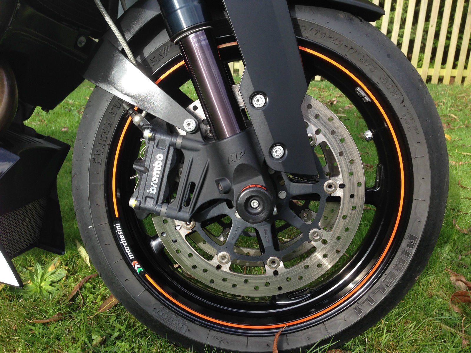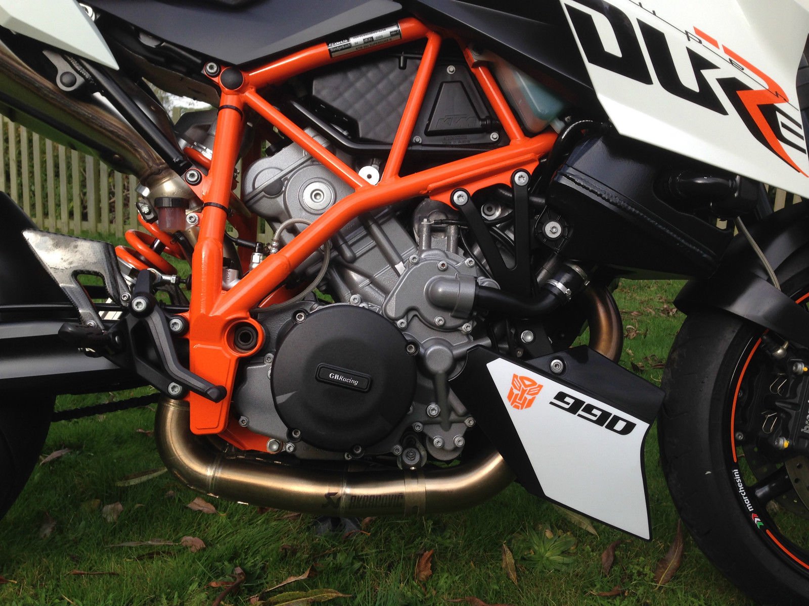 Besides the uprated engine this model included the single seat. Akrapovic headers. Brembo brakes. 16 tooth front sprocket. WP Suspension & steering damper.