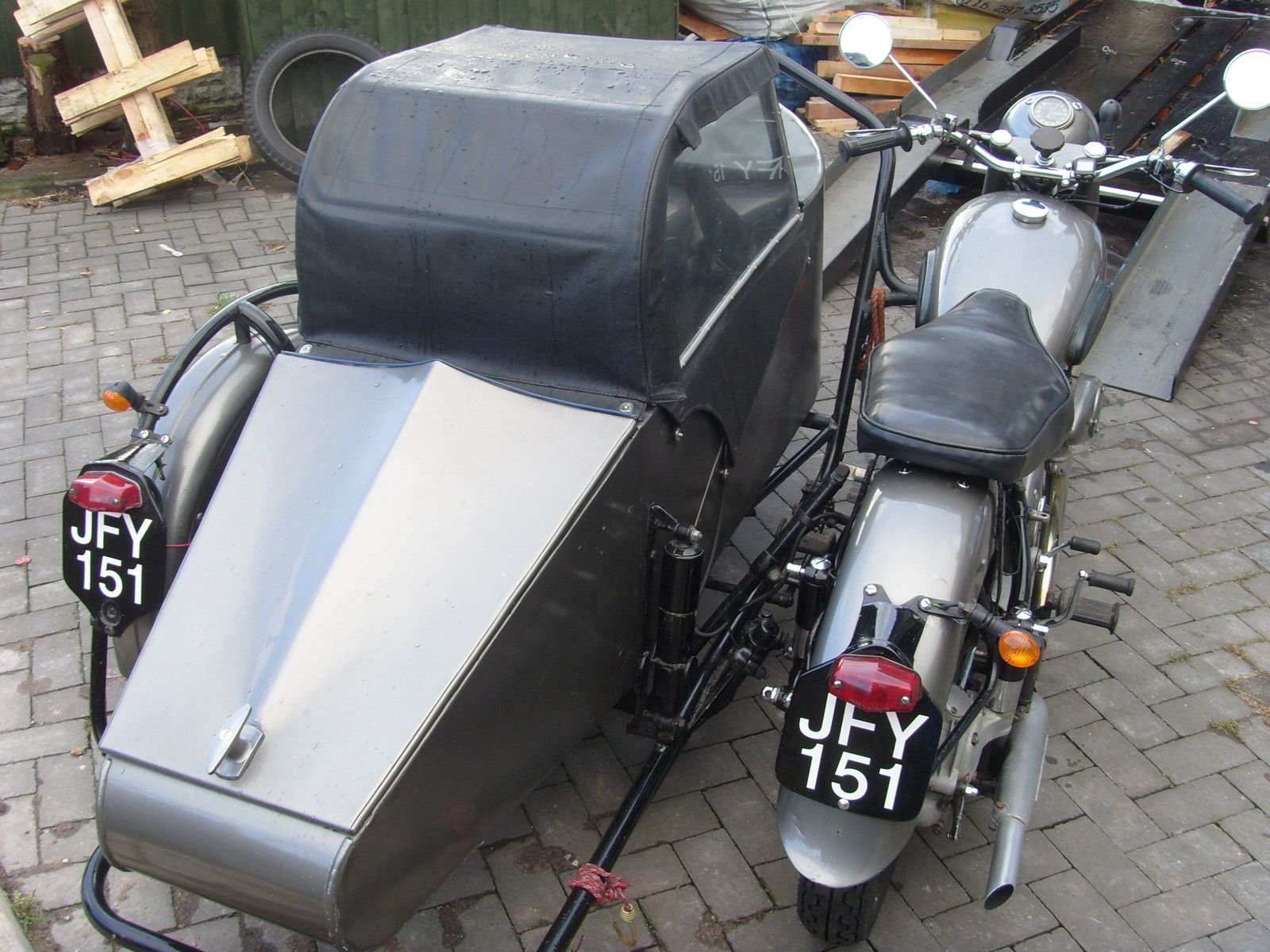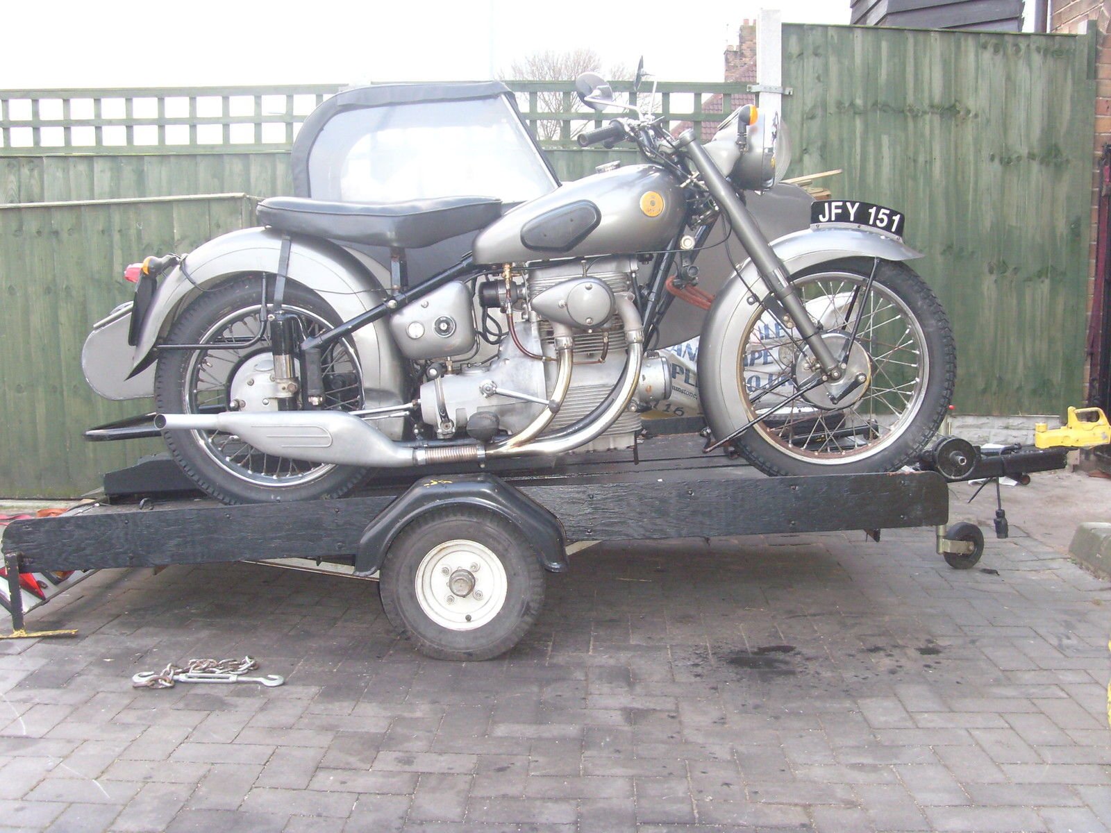 A BEAUTIFULL SHAPED SIDE CAR WITH NICE PROTECTIVE BAR SURROUND. BRAKE IS FITTED TO SIDE CAR. HIS HAS BEEN SOME BODIES PRIDE AND JOY UNTIL PUT INTO STORAGE 10 YRS AGO. I AM NOW SELLING THIS OUTFIT WITH ITS OWN PURPOSE BUILT TRAILER. IT IS LOW LOADING WITH A MANUAL WINCH. SPARE WHEEL.