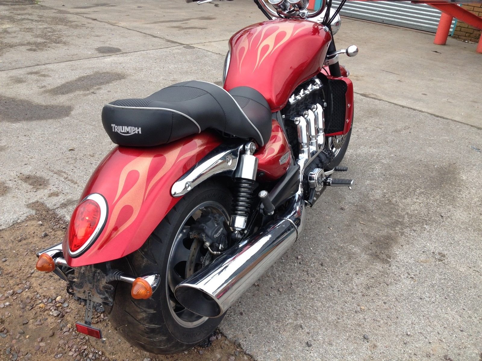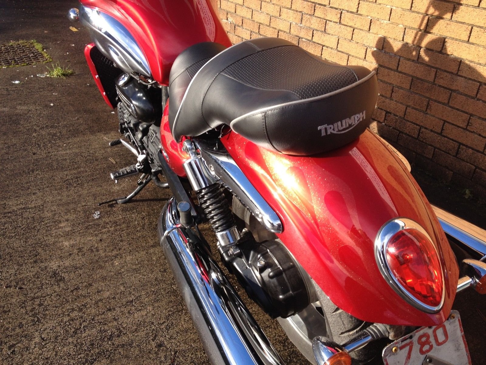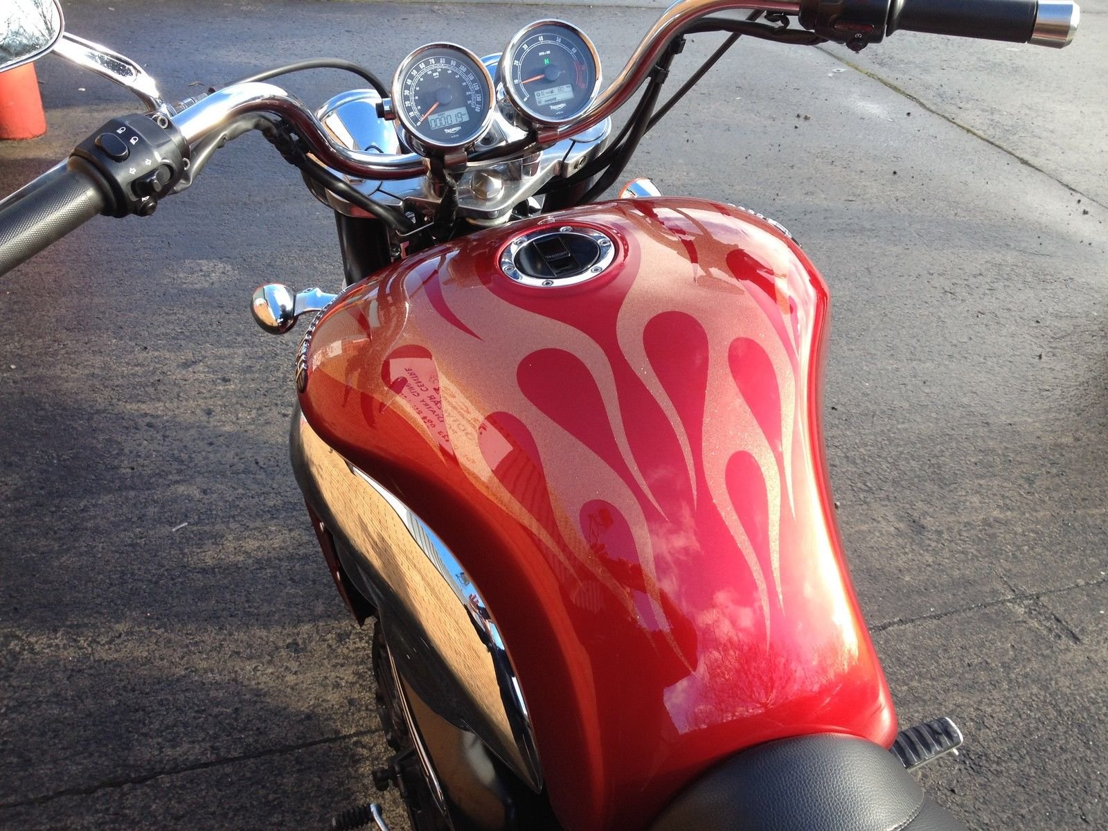 THIS LOOKS THE DOG'S. FRAME HAS BEEN POWDER COATED BLACK WITH A GOLD FLECK TO MATCH THE CARDINAL RED PAINT WITH GOLD GHOST FLAMES FACTORY PAINT JOB ALSO FITTED A NEW CARDINAL RED RAD COWL KIT AS I THINK IT SHRINKS THE HUGE RAD A BIT. ALSO FITTED ONE OF OUR CUSTOM SEATS HAVE A STANDARD IF YOU PREFER & CUSTOM BOTTOM YOKE WE HAVE HAD MADE IN BILLET ALLOY CNC MACHINED WITH SOLID STAINLESS STEEL STEM 30% STRONGER THAN TRIUMPHS YOKE. OTHER SEATS CAN BE SEEN ON OUR WEB SITE WE DO THEM FOR MOST TRIUMPHS. WE HAVE FITTED A NEW SPEEDO AS THE ONE ON IT WAS FAULTY NOW HAS 125 MILES SHOWING ON CLOCK AS WE RODE IT FOR MSVA TEST WHICH IT PASSED AND ALL DOCUMENTS HAVE NOW BEEN SENT TO DVLA TO REGISTER IN UK SHOULD ONLY TAKE A WEEK OR SO BUT THEY HAVE BEEN KNOWN TO TAKE LONGER :).