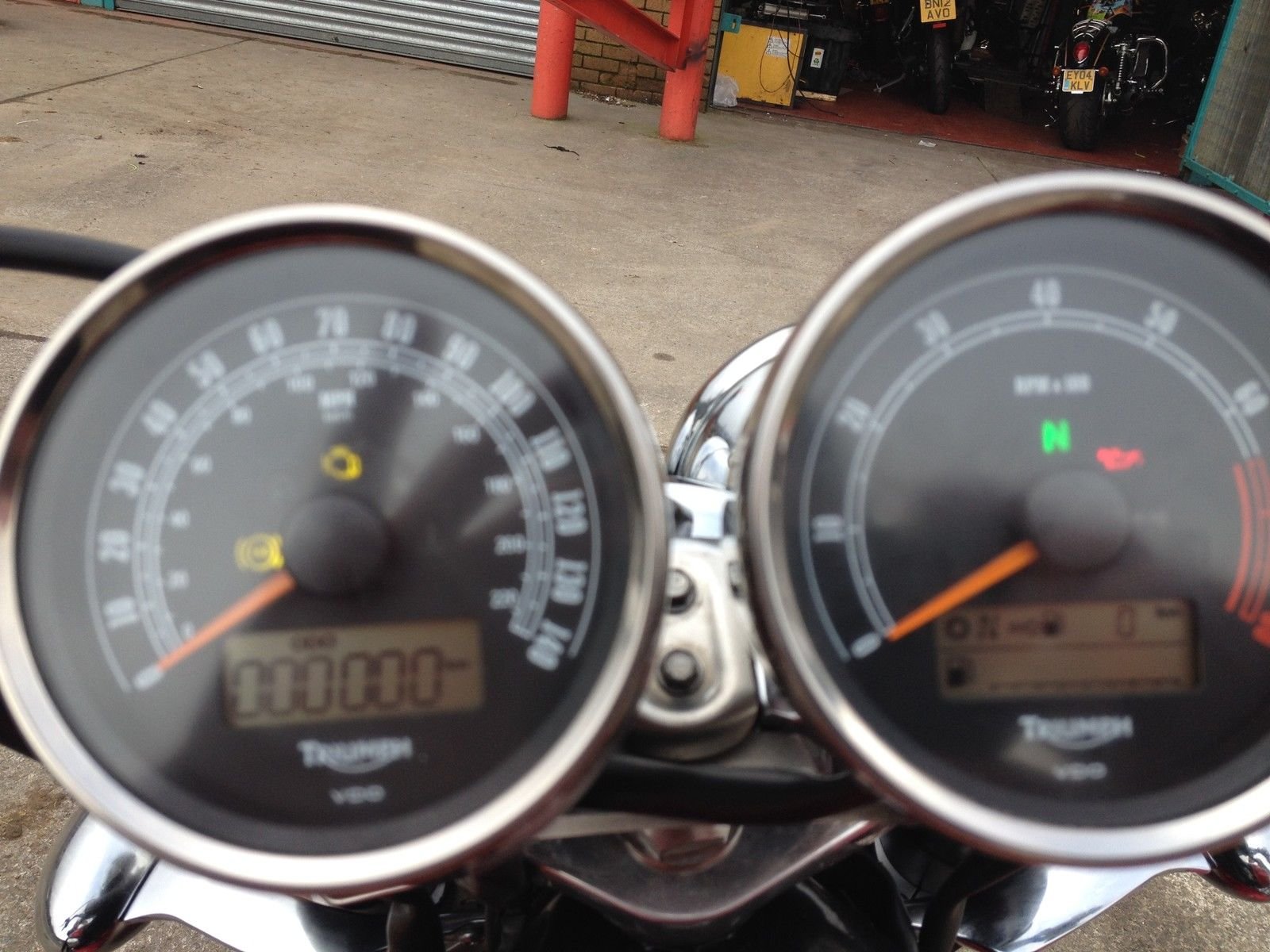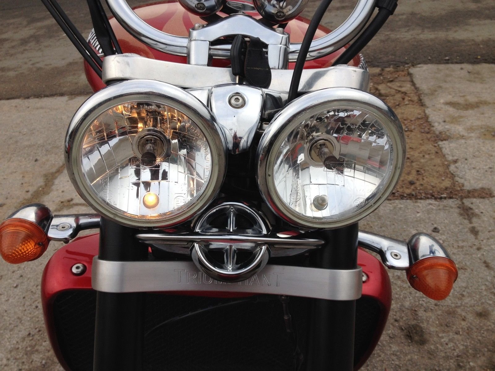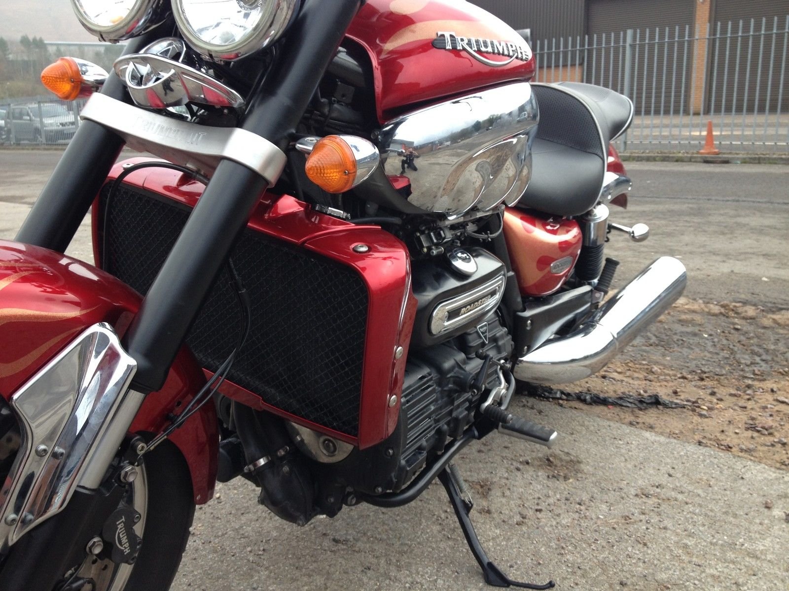 THIS LOOKS THE DOG'S. FRAME HAS BEEN POWDER COATED BLACK WITH A GOLD FLECK TO MATCH THE CARDINAL RED PAINT WITH GOLD GHOST FLAMES FACTORY PAINT JOB ALSO FITTED A NEW CARDINAL RED RAD COWL KIT AS I THINK IT SHRINKS THE HUGE RAD A BIT. ALSO FITTED ONE OF OUR CUSTOM SEATS HAVE A STANDARD IF YOU PREFER & CUSTOM BOTTOM YOKE WE HAVE HAD MADE IN BILLET ALLOY CNC MACHINED WITH SOLID STAINLESS STEEL STEM 30% STRONGER THAN TRIUMPHS YOKE. OTHER SEATS CAN BE SEEN ON OUR WEB SITE WE DO THEM FOR MOST TRIUMPHS. WE HAVE FITTED A NEW SPEEDO AS THE ONE ON IT WAS FAULTY NOW HAS 125 MILES SHOWING ON CLOCK AS WE RODE IT FOR MSVA TEST WHICH IT PASSED AND ALL DOCUMENTS HAVE NOW BEEN SENT TO DVLA TO REGISTER IN UK SHOULD ONLY TAKE A WEEK OR SO BUT THEY HAVE BEEN KNOWN TO TAKE LONGER :).