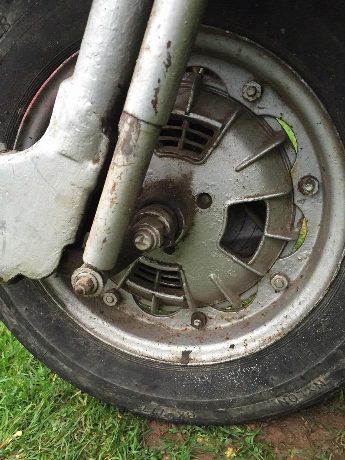 Not so good parts. The head set top is cracked and front Mudgard is scrap along with the horn grill. The leg shields are rusted through on the floor. The kick start has been welded up but I think the shaft has snapped because if you try too kick the engine over the kick start does have some resistance and then jumps and bottoms out! The head front head light rim is missing along with the headlight and the rear light lence.