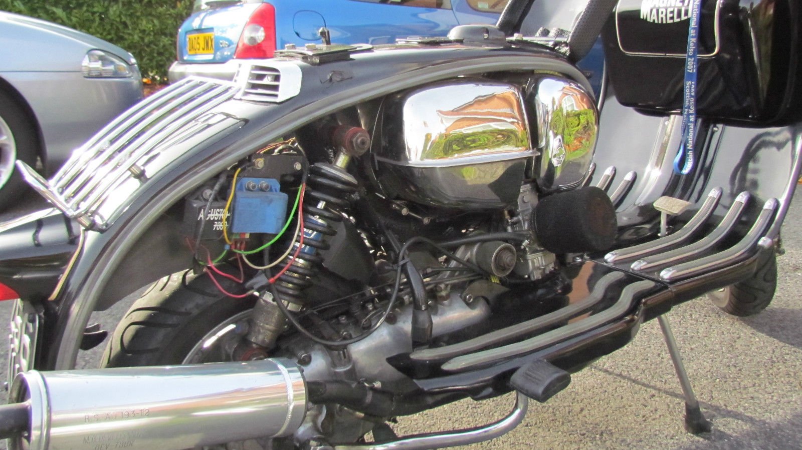 ENGINE- AF TS1 225. 35MM MIKUNI CARB. MB DEVELOPMENTS DEV TOUR EXHAUST. AF 6 PLATE RACE CLUTCH. READSPEED CENTRE PLUG HEAD. AUGUSTO 7000 IGNITION MODULE. DYNO'D AT 23BHP WITH READ OUT. ANCILLARIES-HYDRAULIC FRONT DISC BRAKE. DIGITAL REV COUNTER. LEG SHIELD TOOLBOX. EGT GAUGE (NOT SEEN IT REGISTER). WIDE RIMS AND CONTINENTAL TYRES. ADJUSTABLE REAR SHOCK. LONG RANGE FUEL TANK. LOW FUEL LED INDICATOR ON SPEEDO. RENTHAL GRIPS. MACHINED BAR ENDS. LEG SHIELD HIGH BEAM SPOTLIGHT. 12VDC SOCKET IN LEGSHIELD TOOLBOX. 2 SETS OF KEYS. COMES WITH NEW FLYWEEL COWLING FROM LAMBRETTA RESTORATIONS AS THAT'S THE ONLY SHABBY BIT. NEVER BOTHERED FITTING IT. OUT OF SIGHT. OUT OF MIND.