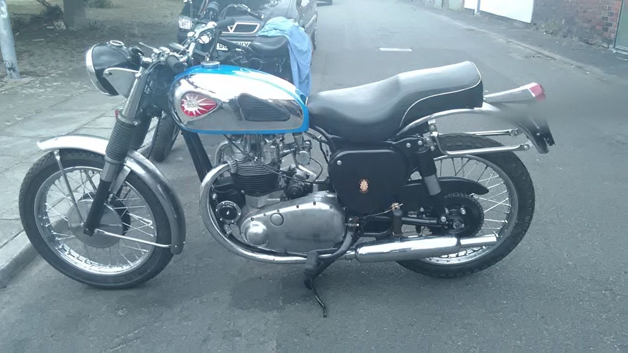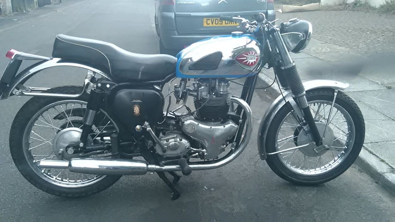for sale 1958 bsa a 10. 650 supper rocket the bike was rebuilt a couple of years ago and was never put back on the road i started it last week and it went second kick but there was smoke out of the exhaust the bike had a complete engine rebuild plus new shocks new wheels rebuilt. front forks had new bushes seals and shafts. plus many other new parts. it got a couple of miner dents in tank as seen in photo it will need i little bit of tinkering with to get it on the road. It got its original registration and is transferable. m. o. t. and tax exempt. frame no. fa73--- engine no da10R --- can deliver at cost