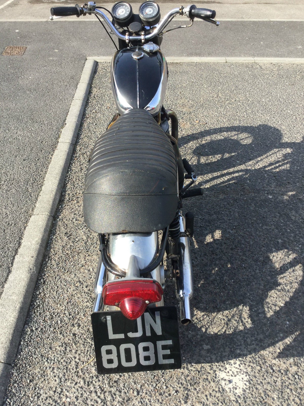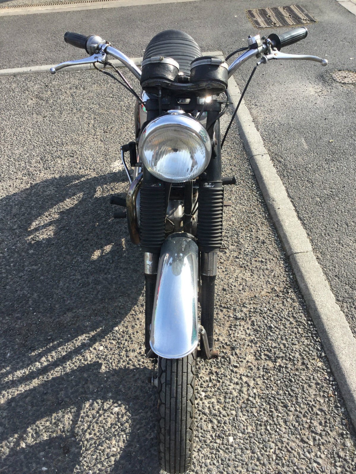 I bought the bike on eBay in 2009. with the intention of riding / restoring it. I have not managed to find the time and so I am now re listing her. When I purchased it. I was not told about some frame damage to the down tubes. The right side exhaust header is scuffed also. Clearly. at some stage the bike has been biffed. I have photographed this as best I can. Having said that. she comes with old MOT's. an old blue V5. a historic dating certificate showing matching numbers and a 1967 manufacture date. It would appear that she was re registered in the UK in 1996. She really is very pretty. allowing for obvious age related scuffs. scratches etc. and has great patina. but now requires a thorough overhaul.