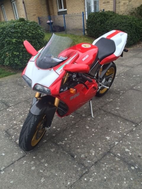 For sale my 2001 996 SPS Genuine UK bike. Low mileage of 15700 but may go up if the sun shines. Only 2 previous owners. This bike has been much loved and cared for and has pretty much full service history. Most of which at Ducati main dealer or Ducati specialists. Lots of previous MOTs to verify mileage. long with plenty of other invoices including original bill of sale. Probably the most detailed history you could find for a bike of this age. All original carbon (airbox. ear hugger. mudguard) plus carbon air intakes (non genuine). Upgraded clutch slave and Brembo RTS master cylinder making clutch lever lighter than most Jap bikes. aves suffering arm pump should you get stuck in traffic. Upgraded brake calipers to Brembo goldline P4 from 996R and Brembo RTS master to match. Gold powder coated Marchesini wheels with Dunlop Sportsmart tyre which have probably only done about 2k. Motographix 3d gel front number board. The bike has just been to Steve Jordan to have the suspension set up and is riding as it should. Alloy fan blade to improve cooling on hot days and silicone hoses throughout. Is currently running on ultimaps chip with Carbon Termi's but still have standard chip and standard termi's along with the paddock stand and bike cover as supplied when new.