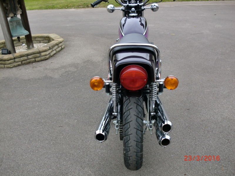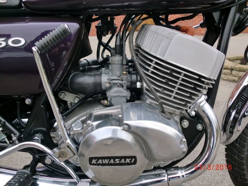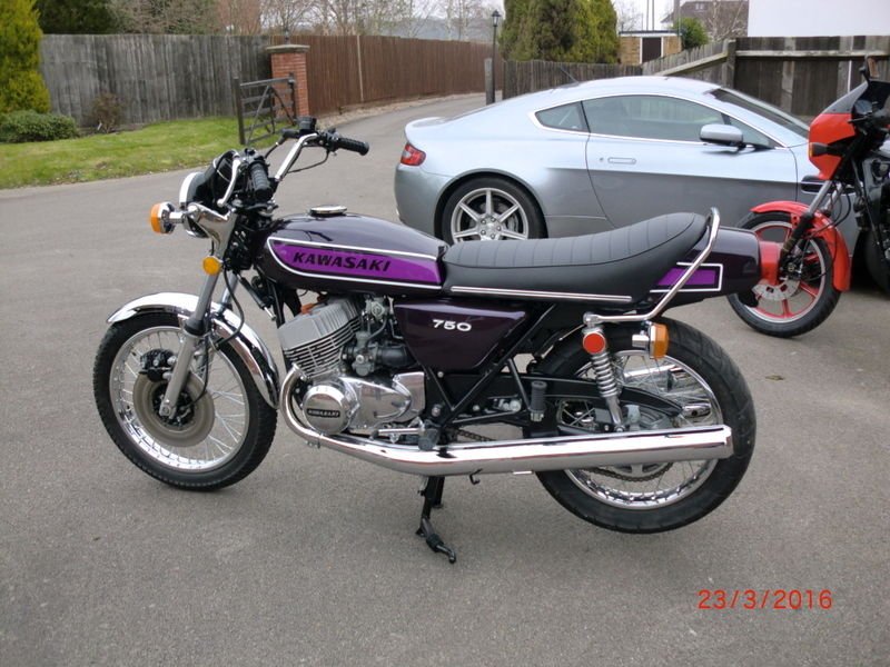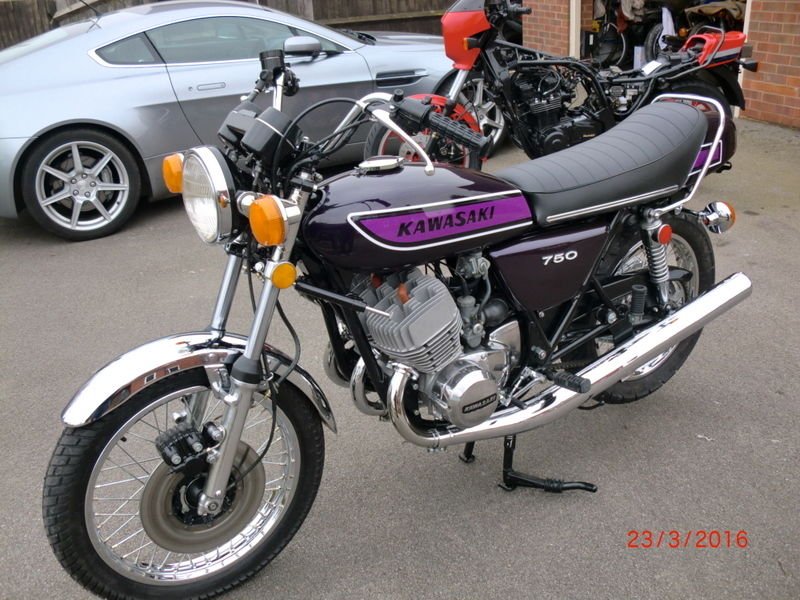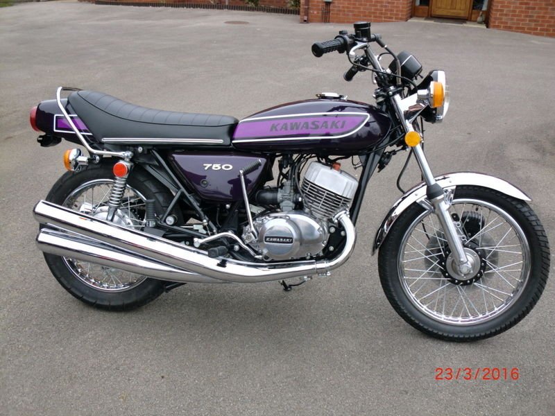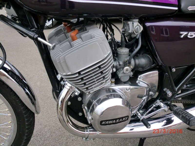 KAWASAKI 750 TRIPLE H2C. 1975. PURPLE. RESTORED TO A VERY HIGH STANDARD. STARTS AND RUNS WELL. HAS COVERED 29 MILES AS PART OF THE RUNNING IN OF ENGINE. BRAKES. TYRES. ETC!