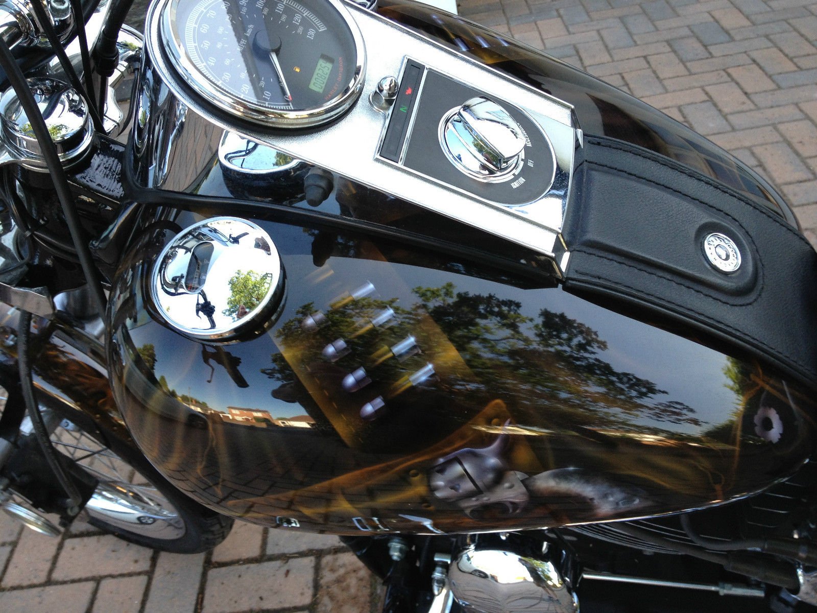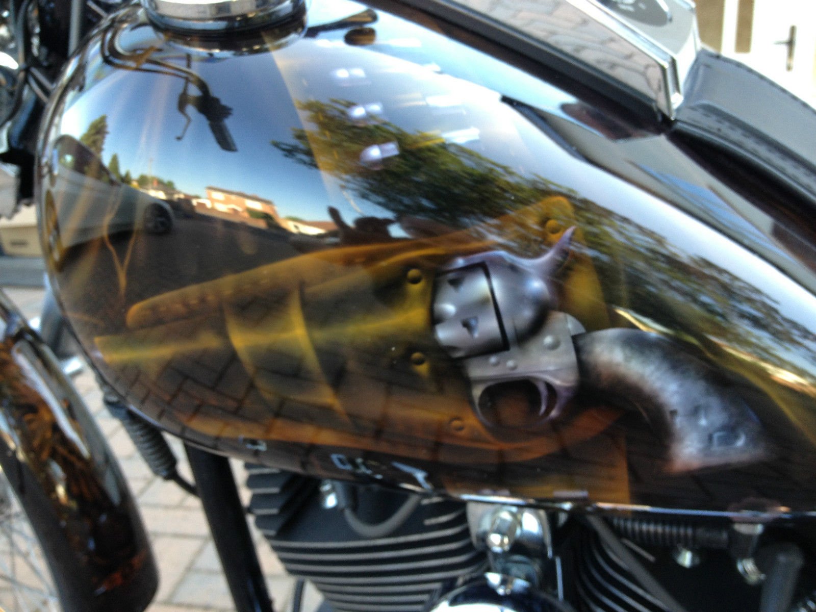 Custom paint in a western theme featuring Colt 45 revolvers. leather holsters. bullets. belts. sheriff badge and bullet holes.