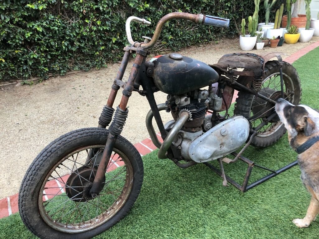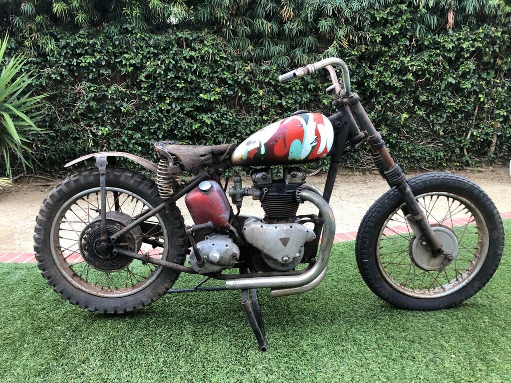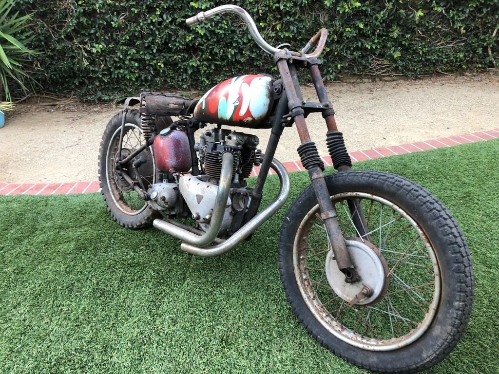 "Woods find" 1950 Triumph Thunderbird 650 pre unit twin. Being sold with a CA title. Rough and not very ready. No engine or primary internals aside from the crank with one seized rod, no pistons, cylinder head is complete. Transmission spins. Includes a stock frame with non matching number cases, oddly enough the frame is 13158N and the Engine is 15138N, the title has the 15138N number. Sprung Hub rear wheel, cut down stock rear fender. Flat track exhaust pipes, antique Harley Davidson Handlebar, Lycette seat and a BTH magneto. Forks are locked solid and tweaked. This bike spent many years up in the woods of Mendocino county in northern California on a hippie commune. It was during that time in the late 1960's that the tank received the psychedelic paint job. Long way to go on this build but what a great opportunity.