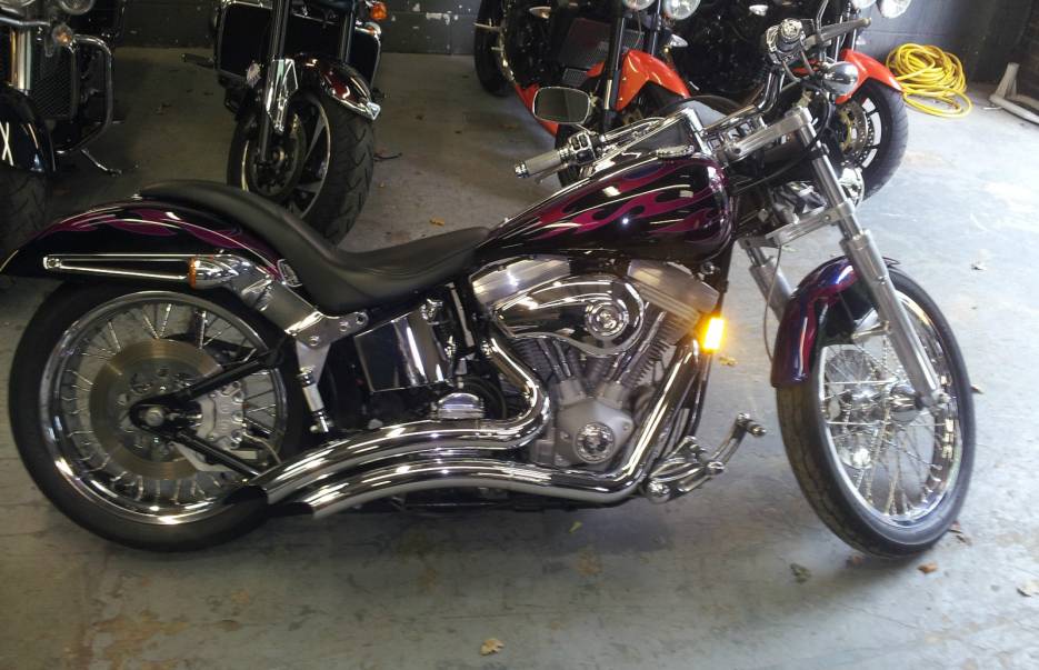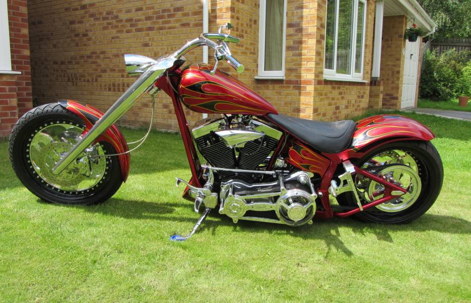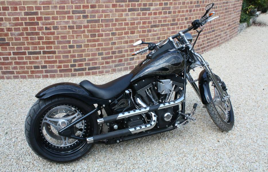 This custom one off build. Was built in house at Thames valley Harley-Davidson working from a new stock Night train. Starting at the front she has a chrome springer fork assembly with standard rake. together with a 21 piece "Mike" Billet custom wheel.